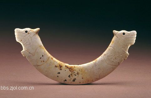 6、玉兽形...高15.4cm,宽10.5cm,厚4.5cm。新石器时代红山文化。 ?i以青黄色玉料制,表面有多处色斑。整体为环形,一侧有一开口,未断开。开口一端为兽首,另一端为兽尾,兽身屈而成环,颈部有二小孔。 目前,多处红山文化遗址中出土了这类器型,它表现的是一种神化了的动物,反映了较大范围的动物崇拜。颈部带有双孔的作品并不多见,此?i可能是制造时所穿之孔位置不理想,作品悬挂时倾斜度不合要求,于是又钻了第二孔。这件作品为清代宫廷遗玉,说明清代宫廷曾收藏红山文化玉器。