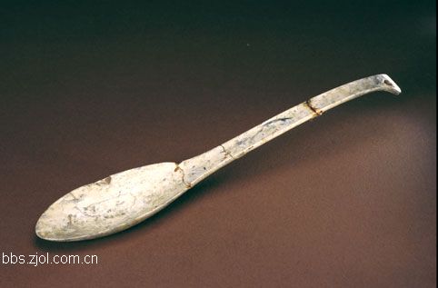 16、玉勺...长16.5cm。新石器时代含山文化。 勺玉料呈灰白色,局部颜色因久埋而产生变化。此勺出土时断为数段。勺形窄而长,头部似舟,池部为下凹的弧形曲面,勺柄细长,近似片状,表面下凹,端部略宽,有一孔。 此玉勺工艺精致,边沿光滑平整,两侧对称性良好,勺头及柄部的凹面应为砣具砣出。其工艺水平与近代琢玉的差别不是很悬殊。勺柄较长,可以远伸,但薄而易折,使用时必须谨慎,因而不是通常情况下使用的餐具。其用途尚需进一步研究。 此玉勺为1987年安徽省含山县凌家滩墓葬出土。