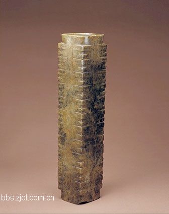 8、玉神人纹多节琮...高32.1cm,孔径6.3-7.2cm。新石器时代良渚文化。 琮呈外方内圆的柱形,上宽下窄,中心有圆孔,上下相通。玉料深褐黄色,局部有黄白沁斑。 玉琮图案以横线截成十一节,每节均以四琮角为人面部的中心线,以四面凹槽为隔界,雕刻出四个简化的神人面纹。神人的冠、鼻清晰可见,圆眼及嘴则模糊不清,只是象征性地刻出。在玉琮上端相对的两侧面中部,隐约可见各有一阴刻的带双翼纹的符号。 《周礼?春官?大伯宗》载:“以黄琮礼地”,说明玉琮是古时人们礼地的祭器。从目前良渚文化墓葬出土情况看,玉琮多置于尸体周围。