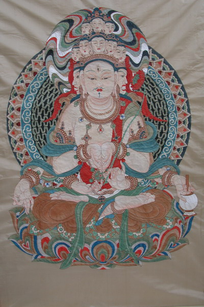 十一面观音,有十一个颜面,象征菩萨修完“十地”(大乘菩萨修行的十个阶位),最后功行圆满,到达第十一地即佛地。打个浅显的比喻,有点像现在小中大学以至博士学位各种毕业证书上标准象之照片合集。描述其形象的佛经有三种:北周耶舍崛多译《十一面观世音神咒经》,唐玄奘译《十一面神咒心经》,唐不空译《十一面观自在菩萨心密言念诵仪轨经》。各种说法不一,故各寺所见形象略有不同。一般当前三面作菩萨善面慈悲相,左厢三面作嗔怒相,右厢三面似菩萨面而作白牙上出相,当后一面作暴怒大笑相,顶上一面作佛面。各戴宝冠,宝冠中有阿弥陀佛像。有二臂四臂两种造型。二臂者常为左手执莲花,右手作施无畏印,臂挂数珠一串。四臂者常为右一手把念珠,右二手作施无畏印,左一手持莲花,左二手持净瓶。