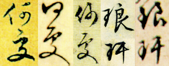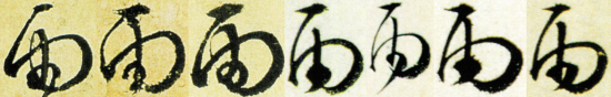 “北風入”这三个字写得极为生硬和呆滞,起笔、行笔、转折无不显示出作伪者笔下功夫的欠缺和对文徵明笔触习性(图2)的懵然无知;“空山”二字,其“空”字用草书写法与上下字比较显得唐突,有夹生之感,且其草法的笔画也写得僵死乏趣,“山”字的形态呆若木鸡,了无文徵明那种爽辣、跌宕的起伏韵律(图3);“古木翠”三个字,笔画僵硬,其中尤以“翠”字最为拙劣,笔触、结体与文徵明迥然有异(图4);“何處”二字,用笔软弱、结体乏俗,“瑯玕”二字字形笨拙、笔画板结,二字之间缺乏连贯的意态,衡之图5,其劣显见;“石泉灑飛雨”五字,其病与“瑯玕”二字无异,盖因用笔无方、笔力全亏,其中尤以“灑飛”二字最为拙劣,比之图6、7,其伪毕现;余下的如“月、乘、過、王、齋、茶、草圖”以及“祿之”、“徵明”诸字,可能无须逐一点评,只需大致比照一下文徵明的真迹字样,真假美猴王自是一眼可以看穿的。
