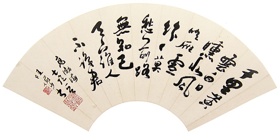 现举一真一疑伪两件署名陆俨少的书法做范例,来具体说明“改变幅式”造假法的基本特点。图1是我在15年前就观赏到的陆书法亲笔,现由浙江某藏家收藏。此作品曾于1994年被编入西泠印社出版的《陆俨少作品精粹》画册中。最近几年时间,我发现有人参照着画册将此作品“相对克隆”出好些件与图2扇面一样的属“改变幅式”性质的成品,并被送到各地的拍卖行去投拍。一经比照便可知,图2与图1虽说幅式与字的行款(每一行字编排的长短与疏密)不同,但图2上每个字的形状(结体)与行笔的动作姿势又完全与图1上的一模一样,这是明显违背于书法创作的书写规律。事实上,凡名家书写的不同作品,即使所写的文字内容相同,一般字的大小与行款就不可能没有差别,那么各作品上字与字的“牵丝映带”的呼应笔线的细节就绝不可能极端地近似。写在不同幅式上的字就更不用说了,不但书法上这样局部的细节有大不同,要是到名家的画作上那差异处将更加明显了。