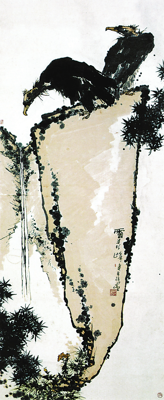 图1这件署名潘天寿的成品,是南方某拍卖行1999年春季拍卖会的拍品。以专业眼光近看此画的笔线,它皆呈似笔非笔、似指非指的视感,且造型也有明显的与潘老固有的不论是指墨画还是毛笔画艺术特点不相吻合之处(石块与鹫鸟的笔线尤甚)。原来此画根本就不是什么真迹,其母本图2系画家潘天寿多次出版过的指墨画佳作《老鹫图轴》,现由潘天寿纪念馆收藏。将它们两者作比较,前者笔墨与造型都很别扭,后者笔墨与造型则奇拙生动,在艺术上显然是泾渭分明。个中缘由是造假者在操作图1疑伪成品时,所用的工具和材质与原作者的不同,即把指墨画按毛笔画来操作了,而主观上却妄图要仿出与原作相近的艺术效果。试想,如此生硬甚至于还有一些可笑的炮制手法,成品哪能不变态呢?不过,该成品的制作也是有所变通,如原作母本的款识署着“雷婆头峰寿者指墨”到疑伪成品上就删去“指墨”二字,改为“雷婆头峰寿者”的名款,确也算是“合情合理”,说明该种作伪也有类似与“相对克隆”之处。
