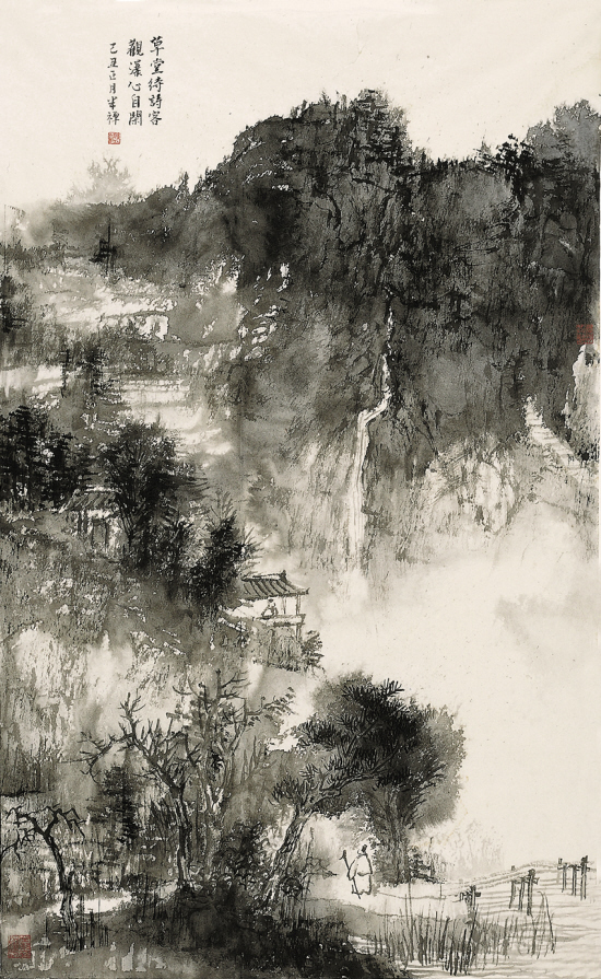 “远观气象,近看笔墨”是传统上把写意国画作品的全局感受(气象)与组合成整体视觉效果基本元素点线面(笔墨)运用统一起来的评判要求。这种组合的美学要求就需要笔墨点线面组合在有序无序之间有完整的平衡点。只有在这个平衡点上创作者与欣赏者的审美评判相契合(相同的审美倾向)相包容(有共通性的笔墨理解)方能产生出两者间交流、互感和共鸣,这也是古人所说的“迁想妙得”妙在“似与不似之间”的传神。而不仅是“谨毛而失貌”的要求。