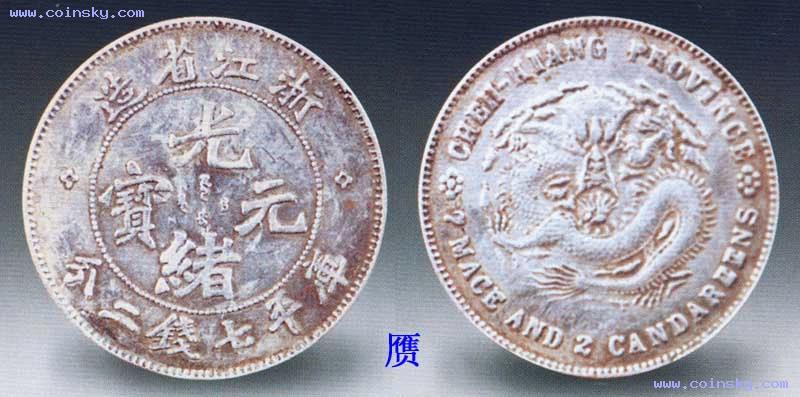 浙江光绪元宝尔宝七钱二分银币,近年新仿品,具体步骤是先按银币图录上的图像刻成祖模,然后翻铸仿品。由于摹刻银币模具的难度很大,再加上无清晰的实物照片作对照,所以仿品严重失真。如正面的满文错误百出,“七钱二分”的“二”字起笔处均下垂,“钱”字的末钩都没有了。背面的英文、龙纹丑陋不堪,连阿拉伯数字“2”都写不好。如这类伪造的浙江尔宝一元银币至少见过十多种不同版式。