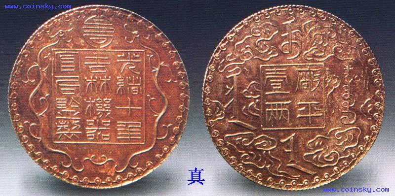 吉林厂平壹两银币,近年新仿品。具体步骤是先按银币图录上的图像刻成祖模,然后翻铸伪品。仿品的字文平夷、图案生硬、制作粗陋。四周的连珠纹直接和外缘相连.而真品的连珠纹还留有一条尾巴与外缘相接。仿品的边齿和普通银币一样,真品的边齿又粗又深,为吉林所独有。仿品的文字书法极差,和真品相比,无一字接近。因是翻砂而成,所以字口间尤为粗糙,用放大镜可看出呈砂粒状态。。