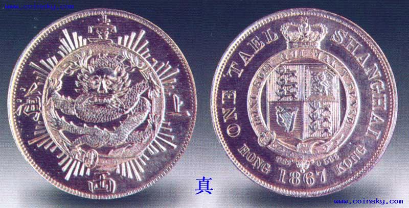 此枚银币的仿品有两类,一类以沈阳造币厂的珍品系列纪念章为代表,改变了原物较厚的规格,使该币的整体重量减轻,这类仿品雕刻虽精但重量不足,较易识别。另一类仿品厚度、重量可以,但币上细致部分较为模糊,尤其是蟠龙的龙鳞和英国国徽的细小图案不够清晰,甚至把1867年上方极小的细字982(代表含银量)和C566(代表英制重量36.67克)刻错,也有删除此细字的仿品。有的仿品还将皇冠上的图案变形。识别此币的关键是甄别和掌握真品的资料,然后才能对照比较出仿品的问题。