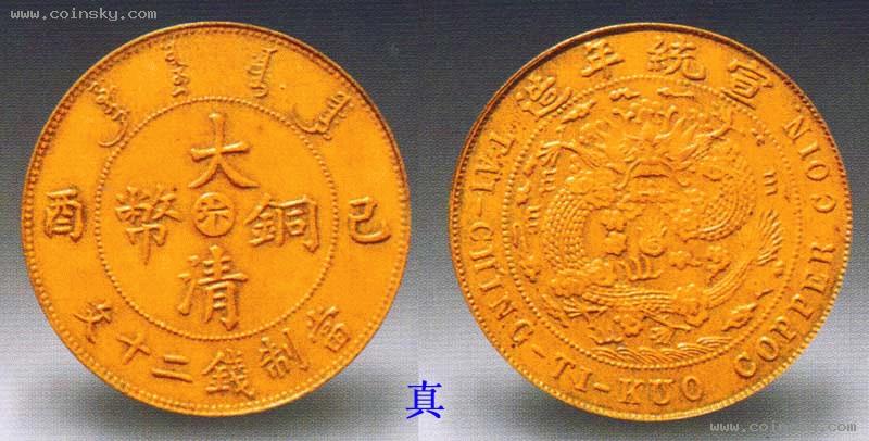 宣统年造大清汴字二十文铜元,近年新仿品。具体步骤是先取软性材料按真币拓图刻成祖模,然后翻铸伪品。黄铜质,表面粗糙,有明显的翻砂痕迹。龙纹浅平模糊,文字失真,如“汴”字写得过分狭长,毫尢美感;“大”字左上方的满文笔画有误。此品为宽边。