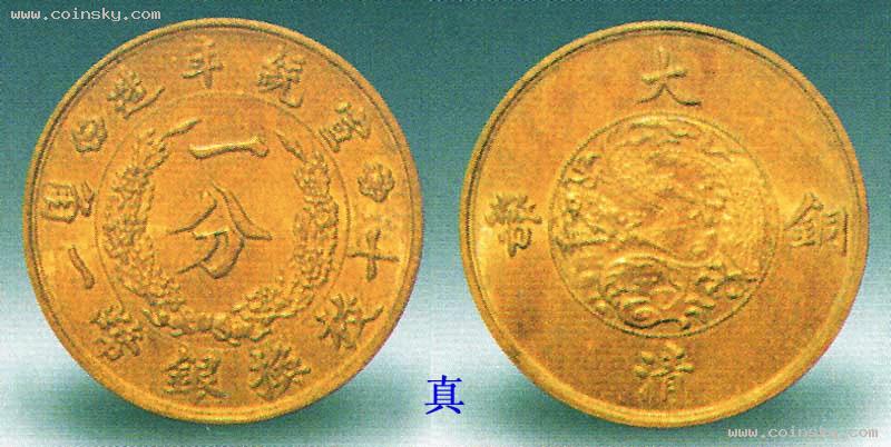 宣统年造大清铜币一分铜元,近年新仿品。具体步骤是先取软性材料,按真币图拓刻成祖模,然后翻铸仿品。此仿品为紫铜质,文字软弱无力,“铜”字的口部已和左竖相接,“统”字的一点过分细小。其图案更差,龙鳞变成了奇形怪状的突起,“一分”左右的花叶杂乱无章,变成了稻穗。类似的仿品还有多种版式,望收藏者留意。