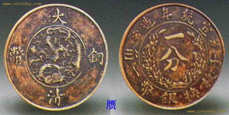 宣统年造大清铜币二分白铜元,1911年度支部造币总厂铸于灭津。白铜质地,设计新颖,图案精美,属试样性质。清宣统二年(1910)政府通过了币制则例,决定废两改元(参见前款)。新币铸成后适逢辛亥革命爆发,于是这套铜元未能正式发行。所见有紫铜、橙色铜及白铜三种质地,白铜者最为稀少,特别珍贵。