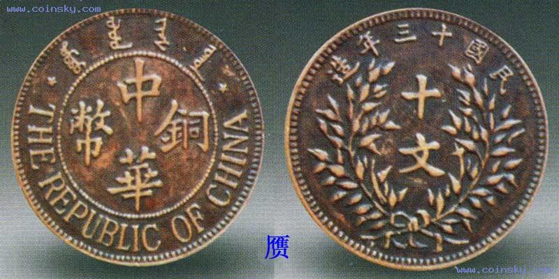民国十三年中华铜币十文,1924年河北省张家口口北造币厂铸造,红铜质。钱文为标准的楷书,背有嘉禾图案,美观大方,制作精良,因未经使用,表面带有铜光。可能因当地满蒙人口较多,所以正面上缘添加满文,在民国铜元中仅见。同时铸行的还有当二十文的十三年双枚铜元,流通较多,系常见品;但十三年中华铜币十文不知何故未曾发行,今所见均属试铸样币,数量不多,相当珍贵。