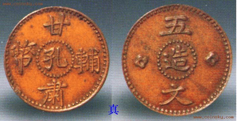 甘肃辅币孔造五文铜元,近年新仿品。具体步骤是先取软性材料按真品拓图刻成祖模,然后翻铸伪品。黄铜质,光边,因翻砂铸成,所以表面粗糙,字口间有明显的砂粒状,仿刻者不懂书法,仿品的文字和真品相比不啻天壤。如“肃”字呈压扁状; “辅”字向右下方倾斜,“币”字的文部过高,“孔”字子部的一横只到一半就停住了。真品的周边是圆珠纹,仿品改成了马齿纹。
