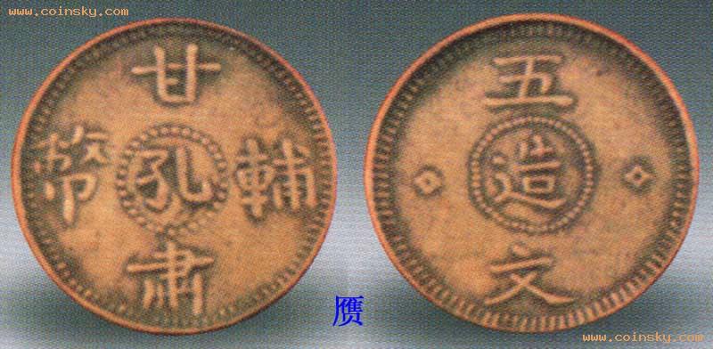 甘肃辅币孔造五文铜元,1924年天水镇守使兼陕甘援川总司令孔繁锦主持铸行。紫铜质,凹边机制铜元,币文为标准的楷书,端庄秀美,表面光洁,铸造水平极高。中国铜元采用凹边技术的不多,光绪元宝户部二十文及四川省民国十五年200文铜元曾一度采用过这种技术,凹边均较浅平,不及孔造五文深峻规整。甘肃孔造五文另有一种翻砂版,表面粗糙,存世较多,远不及机制五文珍贵。