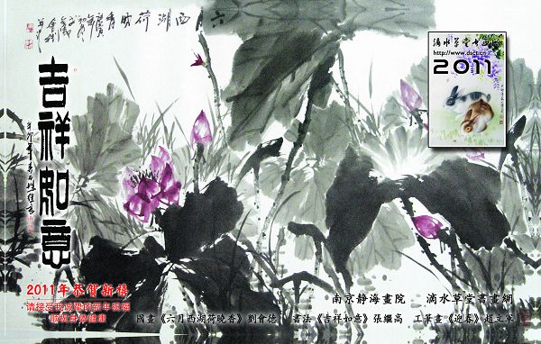 2011年南京静海画院明信片封面设计以南京静海画院刘会德院长国画《六月西湖荷花香》为主题;画院秘书长张继高先生的篆书《吉祥如意》置于明信片的左侧;右上角的邮票样品工笔画《迎春》为画院副秘书长赵立军先生的所作,有2011年、滴水草堂书画网及网址字样;左下角是南京静海画院及滴水草堂书画网字样及作品说明;整体突出刘会德院长国画中的水墨效果显著以及张继高秘书长的篆书功底和传统美感,喜迎免年,更加增添了新年之喜庆!此次2011年南京静海画院明信片得到南京邮政局和印刷厂大力支持!图片设计由可迪图片社(高楼门46号)王诗玉先生提供帮助。特此感谢!