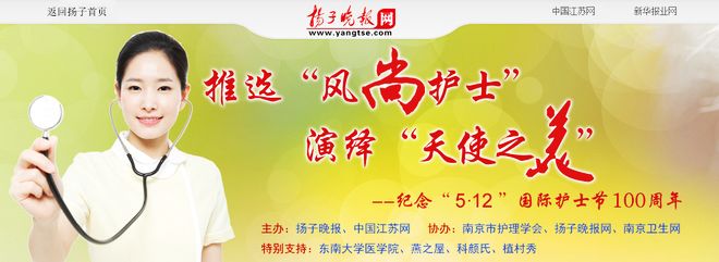 今年5月12日是第100个国际护士节,为弘扬南丁格尔精神,展示护理队伍良好的精神风貌和职业风范,在全社会营造爱护护士、理解护士和尊重护士的良好氛围,昨天起,扬子晚报联合南京护理学会,推出邀请广大读者参与投票的扬子晚报“风尚护士”大选活动, 东南大学医学院为活动提供了专业测试考核的特别协助,“燕之屋”等提供了奖品支持。