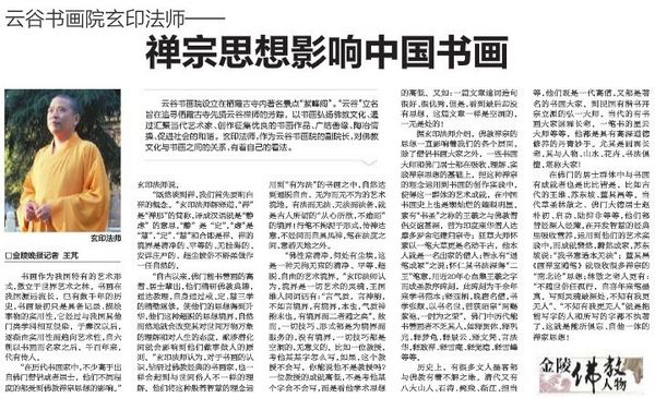 南京云谷书画院设立在栖霞古寺内著名景点“紫峰阁”。“云谷”立名诣在追寻栖霞古寺先贤云谷禅师的芳踪,以书画弘扬佛教文化、通过汇聚当代艺术家、创作征集优良的书画作品、广结善缘、陶冶情操、促进社会的和谐。玄印法师,作为云谷书画院的副院长,对佛教文化与书画之间的关系,有着自己的看法。
