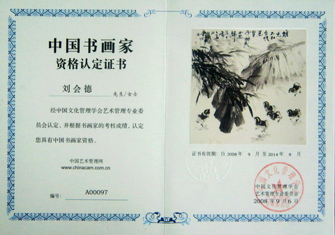 经中国文化管理学会艺术管理专业委员会认定,并根据书画家的考核成绩,认定刘会德先生具有中国书画家资格。