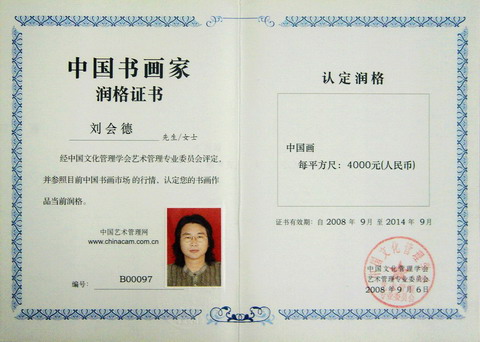 经中国文化管理学会艺术管理专业委员会严格审核,刘会德先生制作的书画作品,准予在中国艺术管理网(http://www.chinacam.com.cn)上推广、介绍并存入艺术管理专业委员会的书画人才数据库。