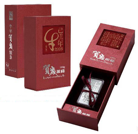 上海金币投资有限公司相关负责人在接收本报记者的采访时表示:“牛年贺岁银条”是中国金币总公司继去年成功发行“鼠年贺岁银条”之后发行的第二个系列化的贵金属收藏品,它共有50克、100克、200克、500克和1000克五种规格。“牛年贺岁银条”背面图案主元素为“俯首牛”形象,衬以“牛”字的草书局部,悬白处缀以“己丑”字样及古文段落,文段悬白处补缀古体“牛”字印章及“贺岁”字样篆章;正面图案为发行方徽记、克重、纯度,并绘以草书的“牛”及艺术书法“年贺岁”字样,再缀“己丑”纪年篆章。该银条采取浮雕、喷砂等先进造币工艺铸造。