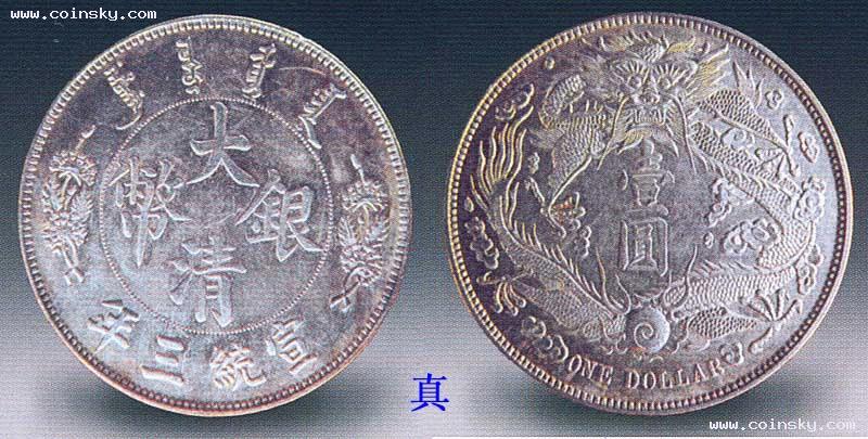 宣统三年大清银币仿品有机制和失蜡制造两大类。在两大类仿品中又有银质和非银质两种不同的材质,通常银质仿品的仿制对象大多为宣统三年的高档样币,普通的曲须龙一般均为非银质材料仿制。其中失蜡制造的仿品可用放大镜观察,凡底面不平,有微小麻点或齿点,龙鳞、文字笔画有粘连者即可断定为仿制品。本图所示的仿品为机制品,用放大镜观察较难识别。可用轻击听声音来辨别,仿品声音大多偏尖、偏长,呈锐音,真品声音适中,呈和音。若能用其他真品银元比照听声,即能明确地辨认出仿品。
