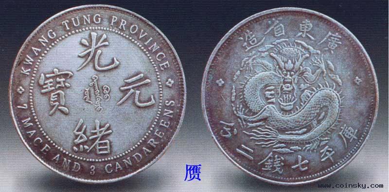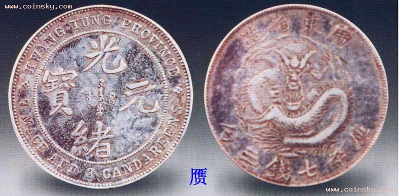 七三反版银币,清光绪十五年(1889)铸于广东,是中国近代首枚正规的机制银元。它的英文放在正面“光绪元宝”的外围,“广东省造”、“库平七钱三分”放在背面龙纹的上下。位置正好和后来的普通龙洋相反,所以称为反版。当时在中国大量流通的外国银币重七钱二分,广东意欲提高银币质量,将银元主币加重一分。但银行业人士认为这样不利于兑换