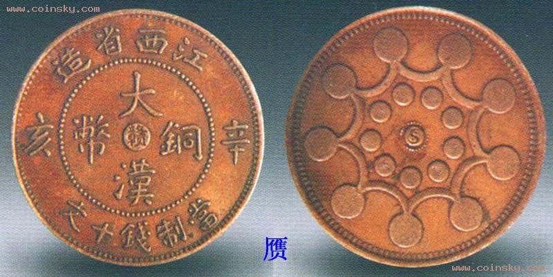 辛亥大汉铜币十文,1911年江西省铸行。1911年10月,武昌新军发动了推翻清王朝的起义,辛亥革命爆发,各省纷纷通电拥护。江西省停铸大清铜币,改行新的大汉铜币,以示推翻满清,复我中华。上书“江西省造”,左右”辛亥”纪年,下书“当制钱十文”。背面为太极十八星图案,底有交叉的网纹。由于铸期极短,这种辛亥年的江西大汉铜币存世仅七枚左右。十分珍贵。