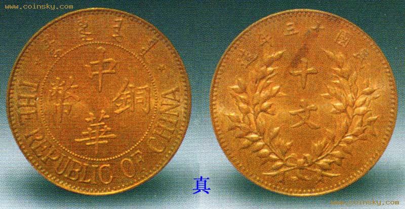 民国十三年中华铜币十文,近年新仿品。具体步骤是先取软性材料按真币拓图刻成祖模,然后翻铸伪品。仿品为紫铜质,制作粗糙,文字失真,如“铜”字的右上横向右下倾斜,真品是向右上方倾斜; “币”字上方的五角星不标准,有一角尖出特长;真品背面嘉禾图案上的谷粒饱满生动,仿品嘉禾上的谷粒变成了尖三角形。类似的民国十三年中华铜币十文仿品不止一种皈式,市上常见。