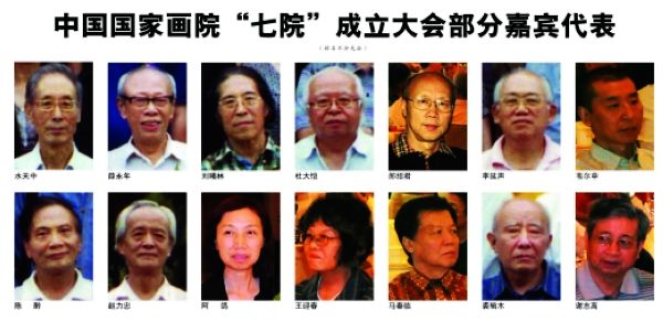 中国国家画院“七院”成立大会于2010年8月31日下午16时在钓鱼台国宾馆芳菲苑隆重举行。文化部部长蔡武,中国文联副主席冯远,国务院编办副主任王澜明,中国国家博物馆馆长吕章申,中国美术家协会主席刘大为,国务院参事室副主任、北京画院院长王明明,中央国家机关工委宣传部部长刘涛,文化部办公厅主任杨建昆,文化部外联局局长董俊新,中国国家画院院长杨晓阳,中国国家画院常务副院长卢禹舜,文化部财务司副司长饶权、马秦临,文化部艺术司副司长诸迪,中国美术家协会副主席曾成钢、许钦松,中国美术家协会秘书长刘健,中国书法家协会副主席申万胜,中央美术学院院长潘公凯,鲁迅美术学院院长韦尔申,天津美术学院院长姜陆,广州美术学院院长黎明,湖北美术学院院长徐勇民,山东工艺美术学院院长潘鲁生,还有以力群、黄永玉、欧阳中石、杨之光、沈鹏、钱绍武、詹建俊、靳尚谊、刘勃舒、杨力舟、韩美林、尼玛泽仁、邹佩珠、郑闻慧、袁运甫、邵大箴、广军等为代表的来自全国各地的著名艺术家,各地方美协和画院的主要领导,文化部、中国文联以及各兄弟单位的嘉宾,中国国家画院的画家和工作人员以及新闻媒体记者共计300余人参加此次大会。