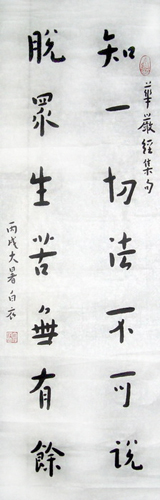 。(吴秀之文)境界是人格的体现,是学养的体现。从事佛学研究多年的刘大任其书法艺术洋溢着空明的禅意,朴实的心境和自然的美趣,让人体悟到其笔墨升华已通向造化之妙,造化之功的境界。观其作品,一种淡逸雅致,清音袅袅,悠远绵长之感如山溪潺潺而流,在淡泊宁静,从容优雅,超逸尘世中一洗浮华火躁之气,抛去功名利禄,欲望需求。