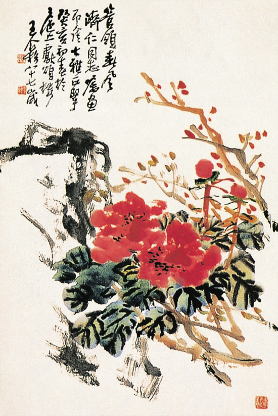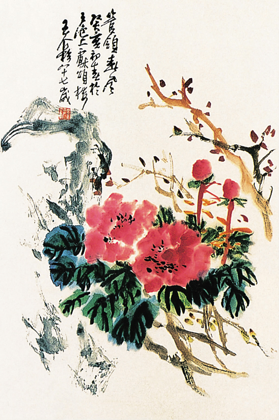 本文要说的书画“局部印刷”造假法,纯粹是作伪者在总结了“全部印刷”某些方面的局限性,为了使造假能随心所欲及让成品的外观更接近真迹而采取的近乎“因地制宜”的举措。以作伪者的思路分析, “全部印刷”既有优势也有不足。其优势是造假便利,效率高,产量多与质量稳定;其不足是当作伪者选取非书法或简单型国画作母本时,最后成品的总体仿真效果势必要逊色一些。因此,“局部印刷”就是为摆脱印刷的制约,它视母本的具体情况依照“适合”为准则,实施有的手工有的印刷的兼合操作手法。比如,若造假大写意类型的名家画作,就先以手工仿着画写意的内容(仿得不满意可推倒重来,直到“像”为止再进行下一道工序),待“画”的部分完成后再以印刷手段来复制题款。如此一来,整个造假就有点“扬长避短”的意思了。非但伪成品的整体制作效果逼真许多且造假的操作难度还大为降低。现在请大家随着我看两件暑名王个簃作品的心路历程,来直观地感受此种书画作伪手法的“高妙”之处。
