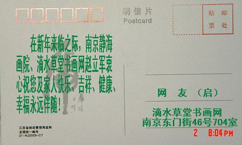 二O一O年南京静海画院、滴水草堂书画网的明信片以高雅、活泼的风格来体现静海画院喜迎虎年新年的到来,特别是画院秘书长张继高的草书“虎”字更显时代的气息,明信片的正面画中以两只迎春待飞的小翠鸟,活泼可爱,此扇面的国画题为“春风”,是画院刘会德院长之作,整幅明信片以赵立军副秘书长的工笔画“迎春”为底衬,明信片的反面左侧是张继高的大幅淡灰色“虎”字!2010静海画院明信片由画院赵立军、可迪广告设计公司王诗玉共同设计。