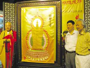 人们围拢仔细欣赏,发现阿育王塔织造的细致入微,“太漂亮了!”留着一头披肩长发的云锦传人、这件作品的设计者郭俊大师对记者介绍说,作品幅宽90厘米,长150厘米,因此采用了超大织机,作品融合运用了云锦中丰富的吉祥图案素材,浓墨重彩,金翠交辉。