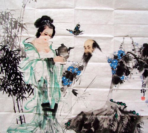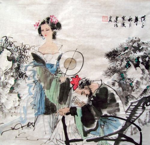 人物画的造型理论一直是围绕“形神”问题展开的。写“形”是为了传“神”,要想更好的达到传神的目的,离不开物象的基本形似。这就需要人物画家要具备扎实的造型基本功,如此才能达到“形神兼备”的效果。朱建强早在学生时代就很注重人物造型的学习,他以历代名家名作为范本,进行反复临摹,从中吸取营养,在传统的造型和线的技法上融会贯通,结合人物的写生,逐步达到了形准神似的艺术效果。三是朱建强的作品散发着浓重的地域文化气息。吴越文化是中国文化的重要组成部分,在画家的笔下,江南的优美是不可拒绝的梦境,它即属于诗歌,它更属于绘画。那些具有代表性的江南人物载入江南文化精神,叙述在江南发现的诗性文化精神,以及文人在江南的激情与思绪、寂寞与徘徊,更有红颜与帝王的江南旧事。这些文化的经典都可入诗入画,朱建强先生的绘画大量地吸收了这些素材,把这些江南文化的精髓用笔墨语言进行倾诉,以气韵生动的面貌呈献给读者,给读画者以愉悦的感受